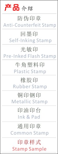 ◆传统的橡胶印章 ◆制造方便,价格低廉 ◆需要配合印泥、印台使用 ◆使用不算方便,且不环保 ◆随使用时间慢慢磨损和腐蚀